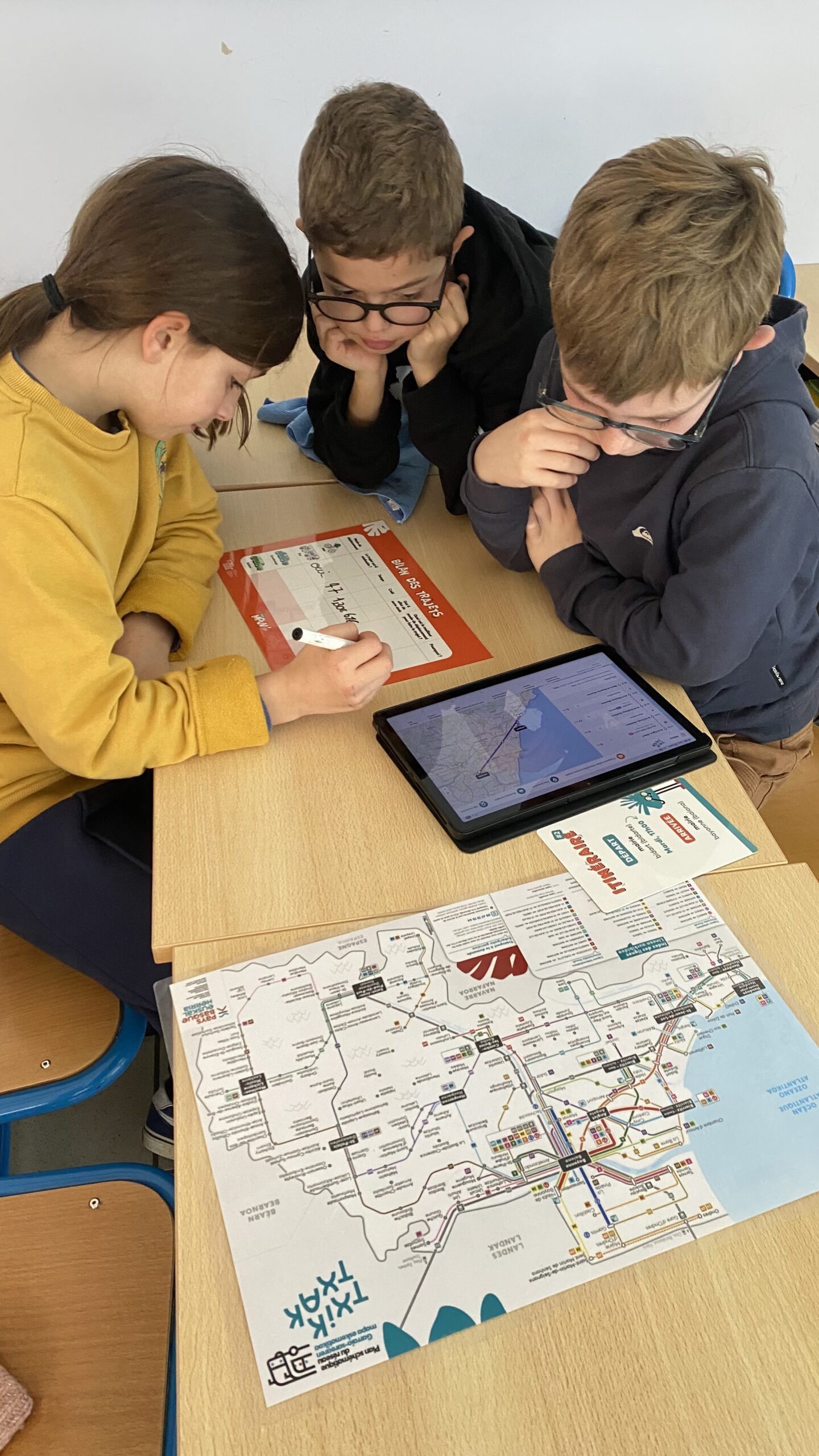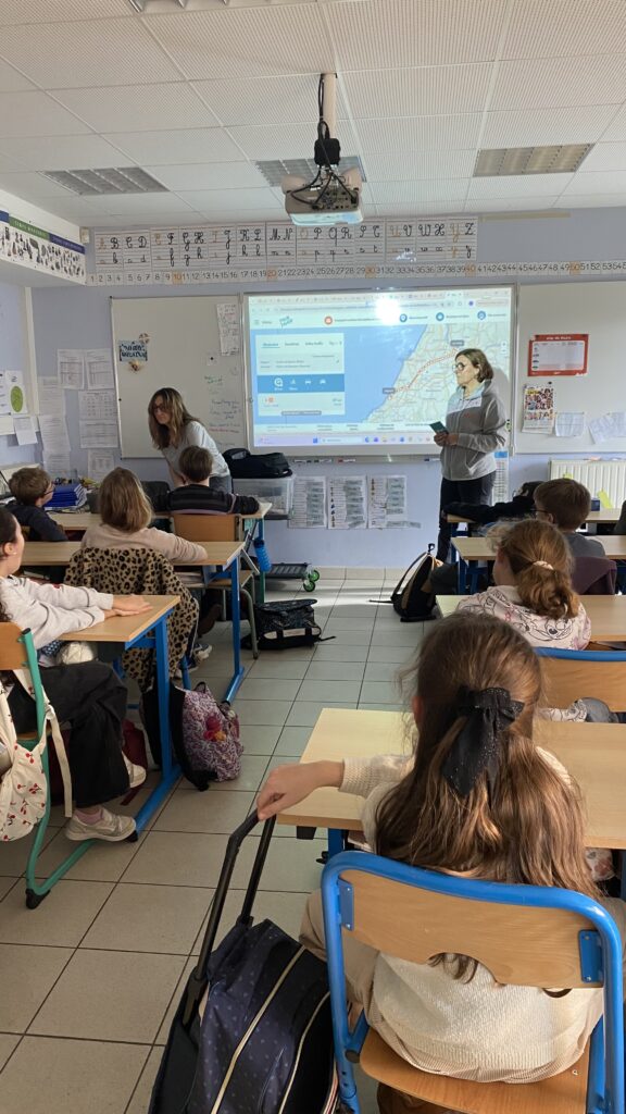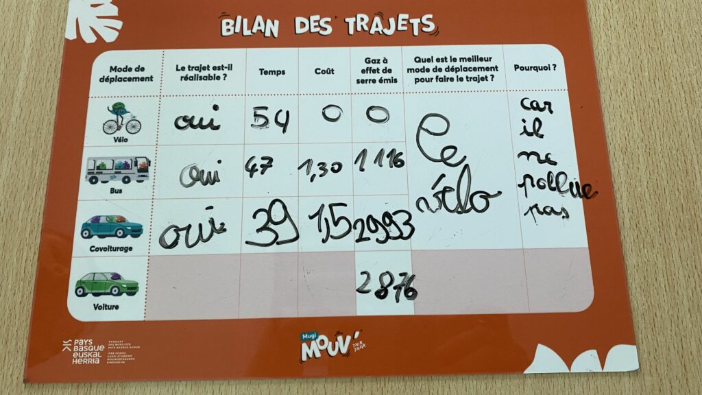 Jeudi 29 janvier 2025, dans le cadre du programme de sciences, géographie et EMC, des animatrices du syndicat des mobilités Pays Basque ont animé une séance pour la classe des CM bilingues pour leur faire comprendre l’impact de nos mobilités sur l’environnement en leur montrant que pour un même déplacement dans le Pays Basque, il y avait différents moyens de transports (bus, vélo, covoiturage) avec chacun différentes productions de CO2. Ils ont appris à utiliser le site Txik Txak pour prévoir un déplacement d’un endroit à un autre en choisissant le meilleur moyen de transport par rapport au coût, à l’émission de CO2 ou à la durée du trajet.